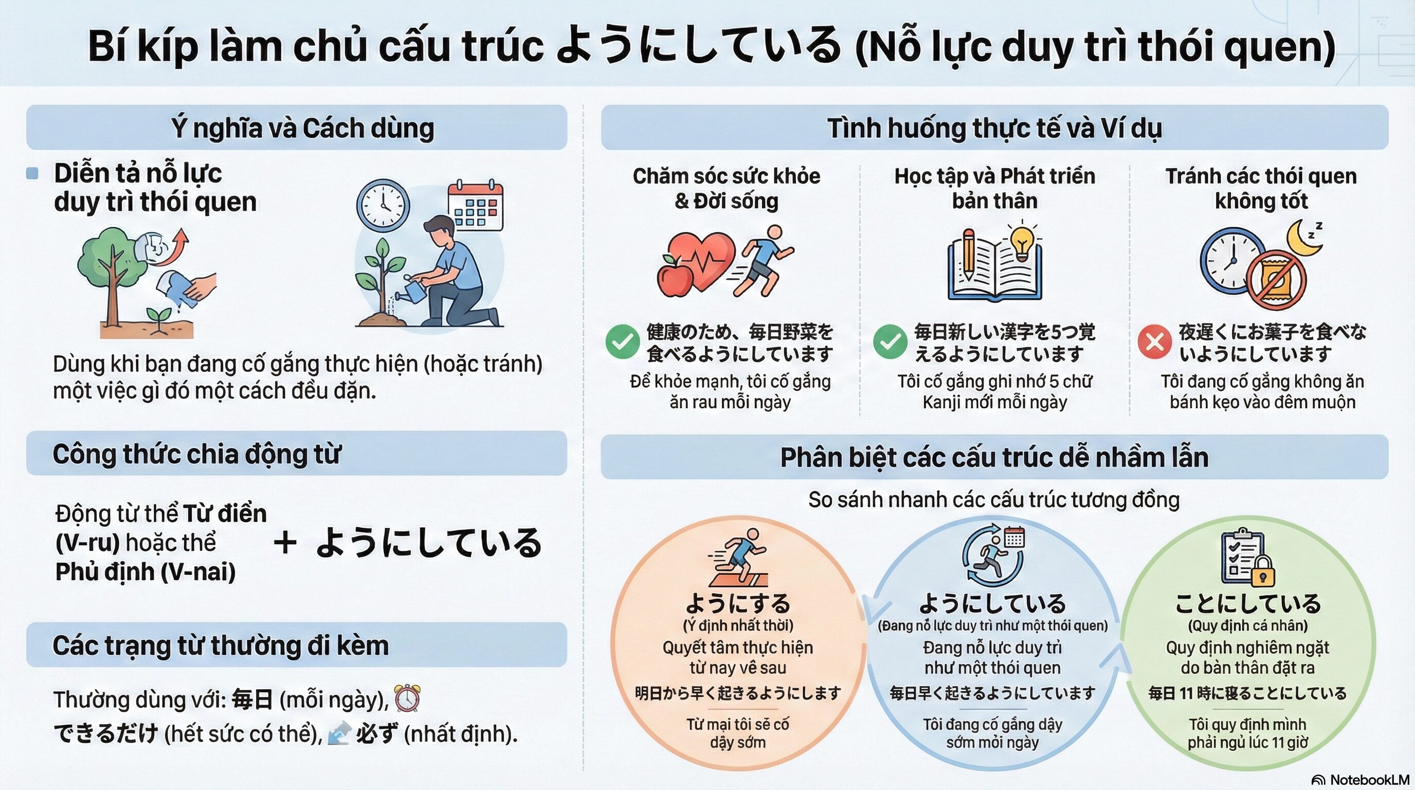 - ようにしている: Nhấn mạnh vào Quá trình nỗ lực (Struggle). Bạn dùng mẫu này khi muốn nói rằng bạn đang “cố gắng hết sức” để thực hiện, dù đôi khi có thể gặp khó khăn hoặc thỉnh thoảng thất bại.