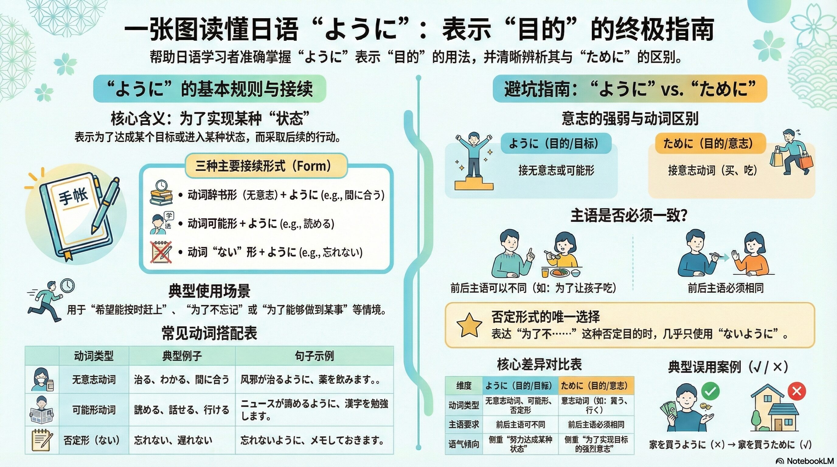 专家总结: 〜ために 是向着目标迈步,而 〜ように 是为了让目标显现。希望这份指南能帮助你在日语表达中游刃有余,更地道地传递你的意图。继续加油!