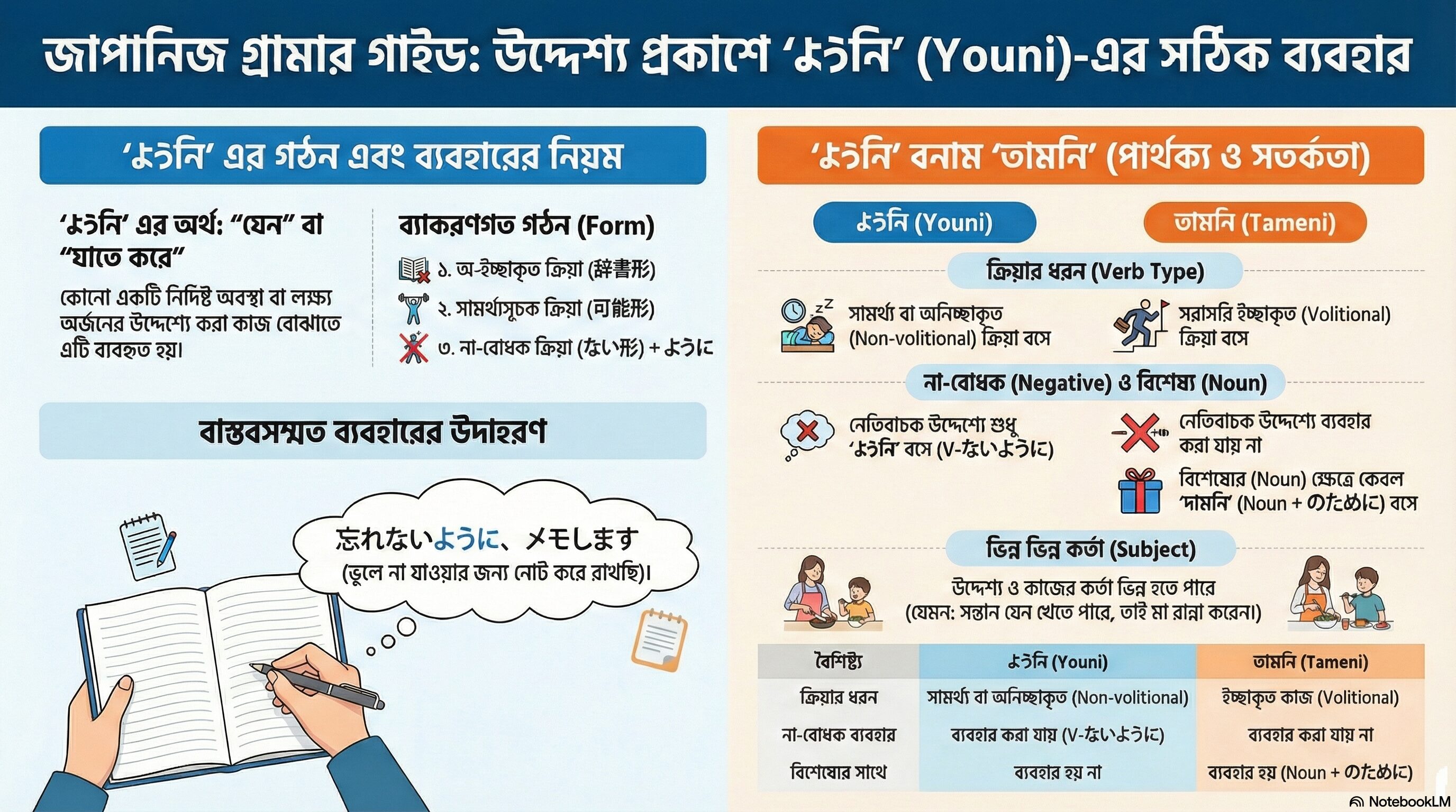 শিক্ষার্থীদের সবচেয়ে বড় চ্যালেঞ্জ হলো এই দুটির পার্থক্য বোঝা। মনে রাখবেন: Tameni = Action (সরাসরি কাজ), Youni = State (অবস্থা)।