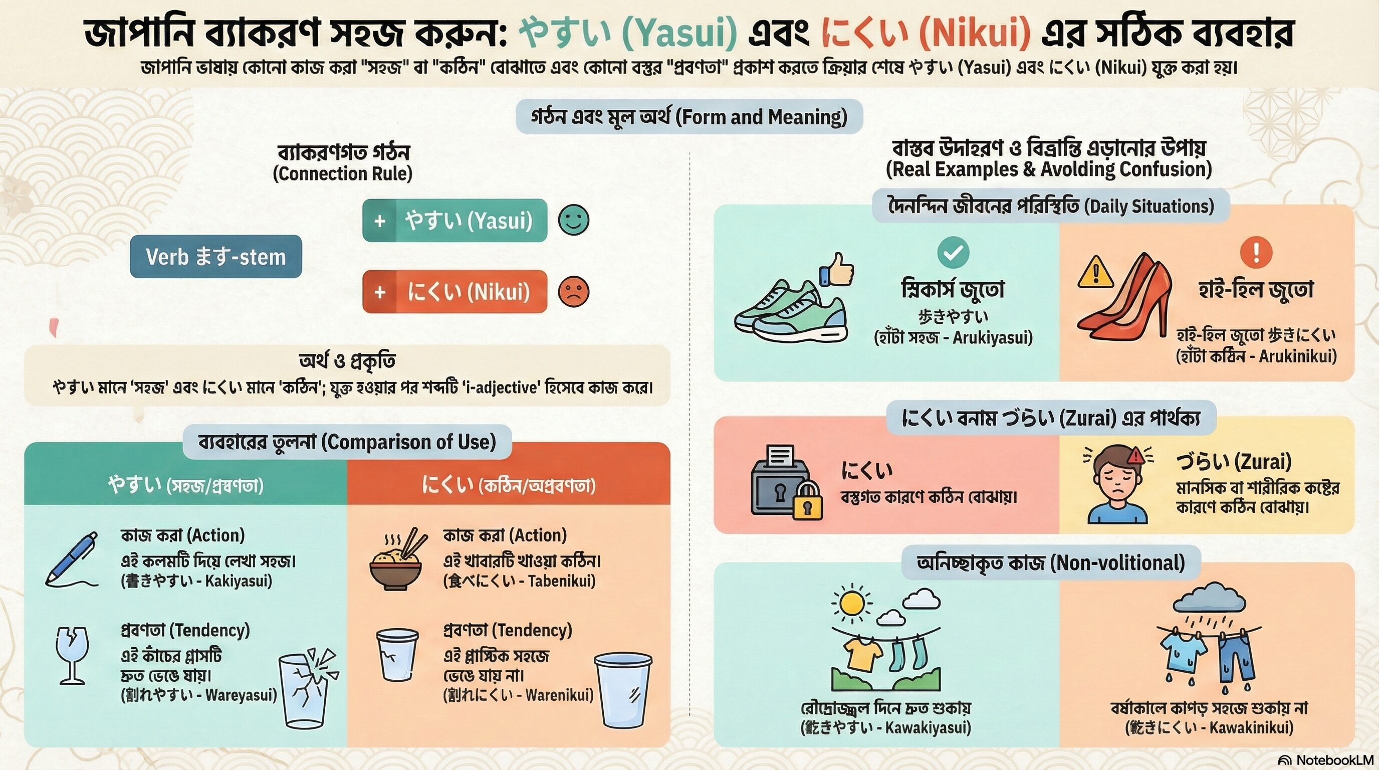 - সতর্কতা: ‘সহজ’ বা ‘কঠিন’ বোঝাতে সরাসরি বিশেষ্যের সাথে ‘やすい/にくい’ ব্যবহার না করে ‘簡単 (Kantan)’ বা ‘難しい (Muzukashii)’ ব্যবহার করুন।