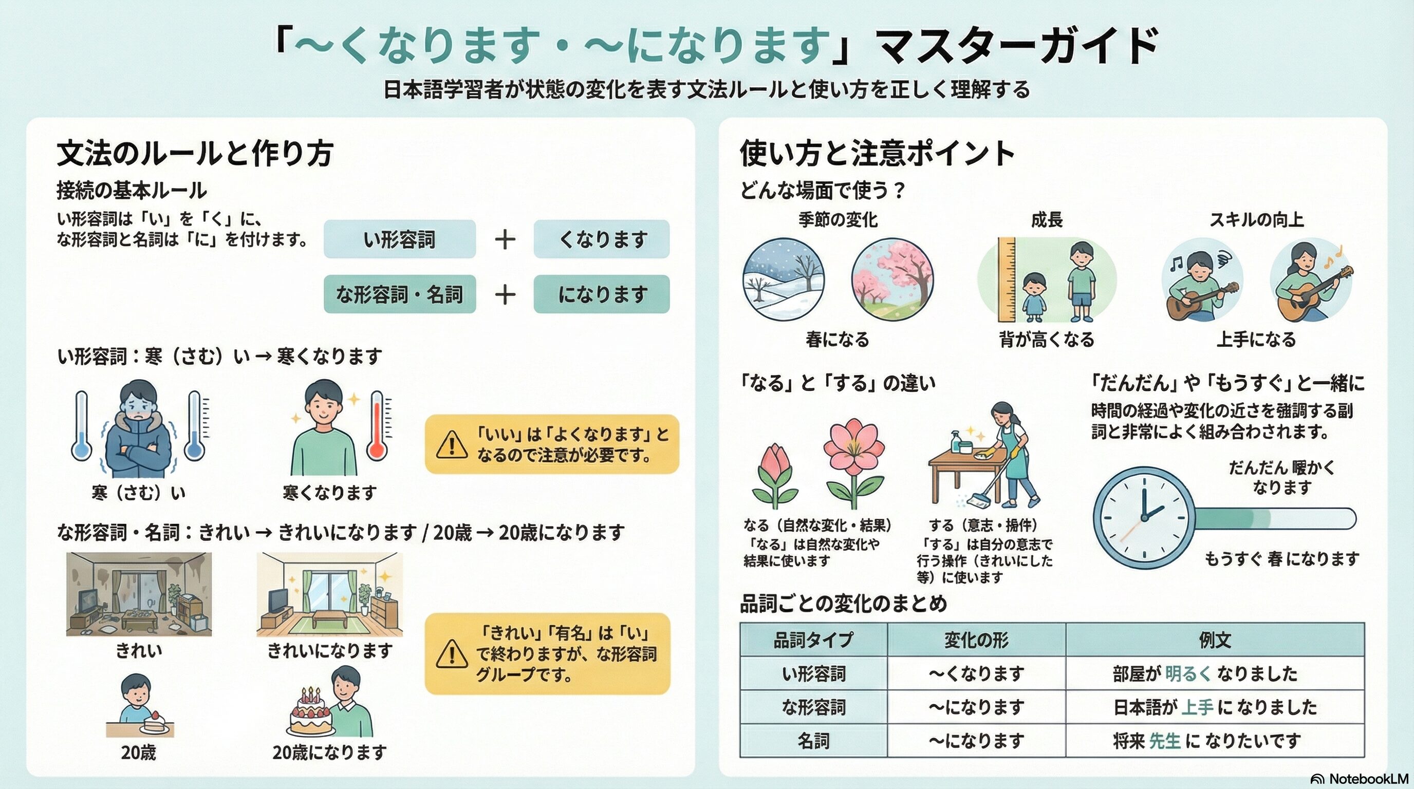 日本語(にほんご)の「変化(へんか)」をマスターしよう!「〜くなります」と「〜になります」の使(つか)い方(かた)ガイド