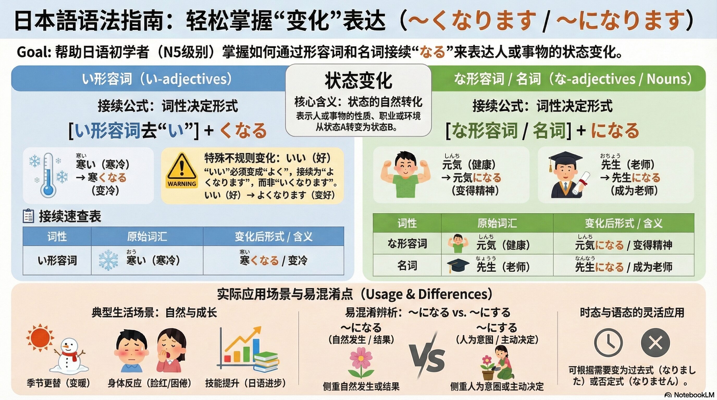 很多海外自学的同学经常在“くなります”和“になります”之间纠结。作为一名拥有15年教龄的老师,我深知这里的“坑”在哪里。今天,我就把这套“变化的魔法”拆解开来,带你彻底攻克这个N5核心语法!