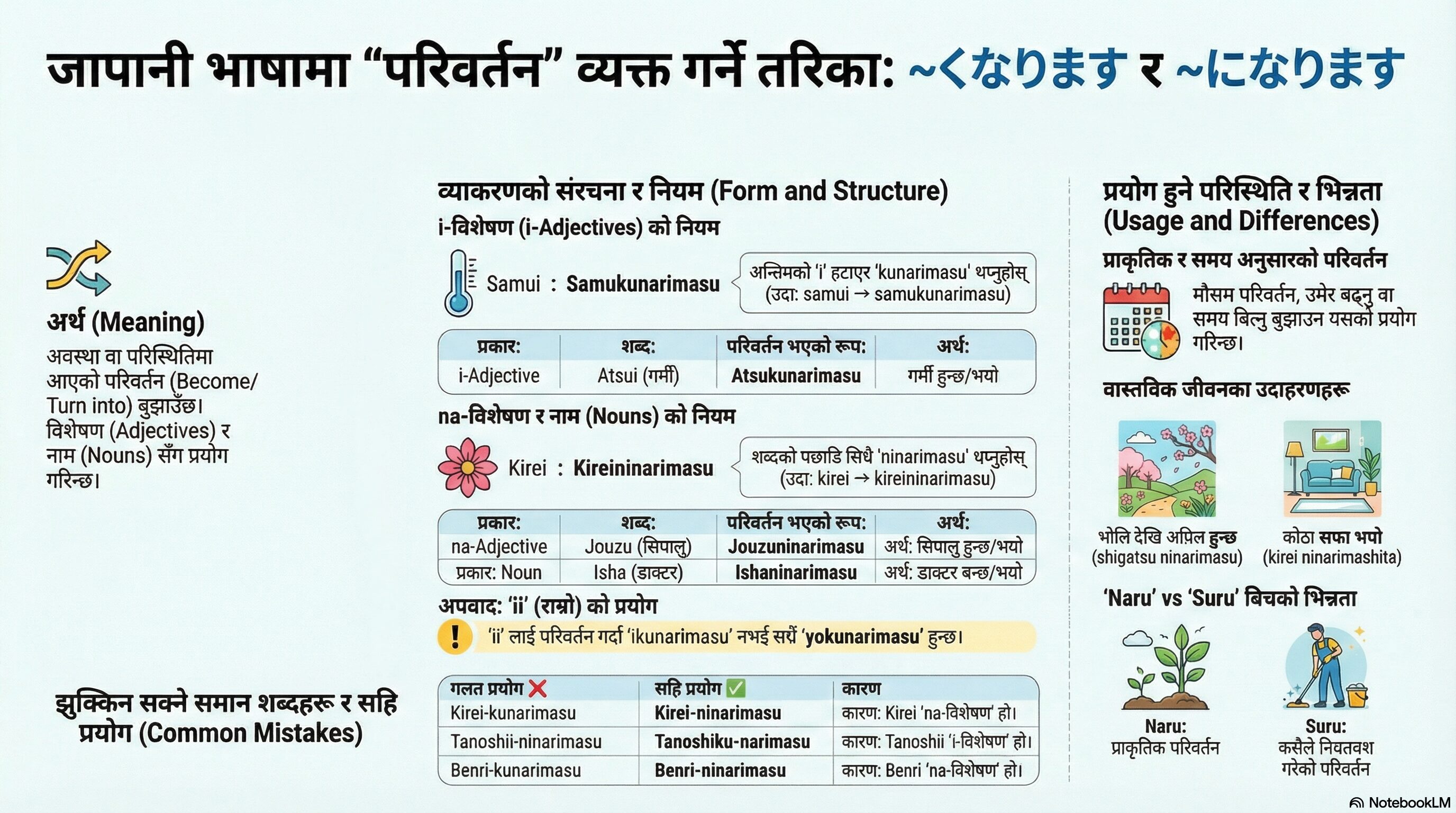 जापानी भाषामा यस्ता परिवर्तनहरूलाई व्यक्त गर्न 〜くなります (ku narimasu) र 〜になります (ni narimasu) को प्रयोग गरिन्छ। यो जापानी भाषा परीक्षा (JLPT) N5 स्तरको अत्यन्तै महत्त्वपूर्ण व्याकरण हो। आजको यस गाइडमा हामी यसको प्रयोग र नियमहरूका बारेमा विस्तृत प्राविधिक जानकारी दिनेछौं।