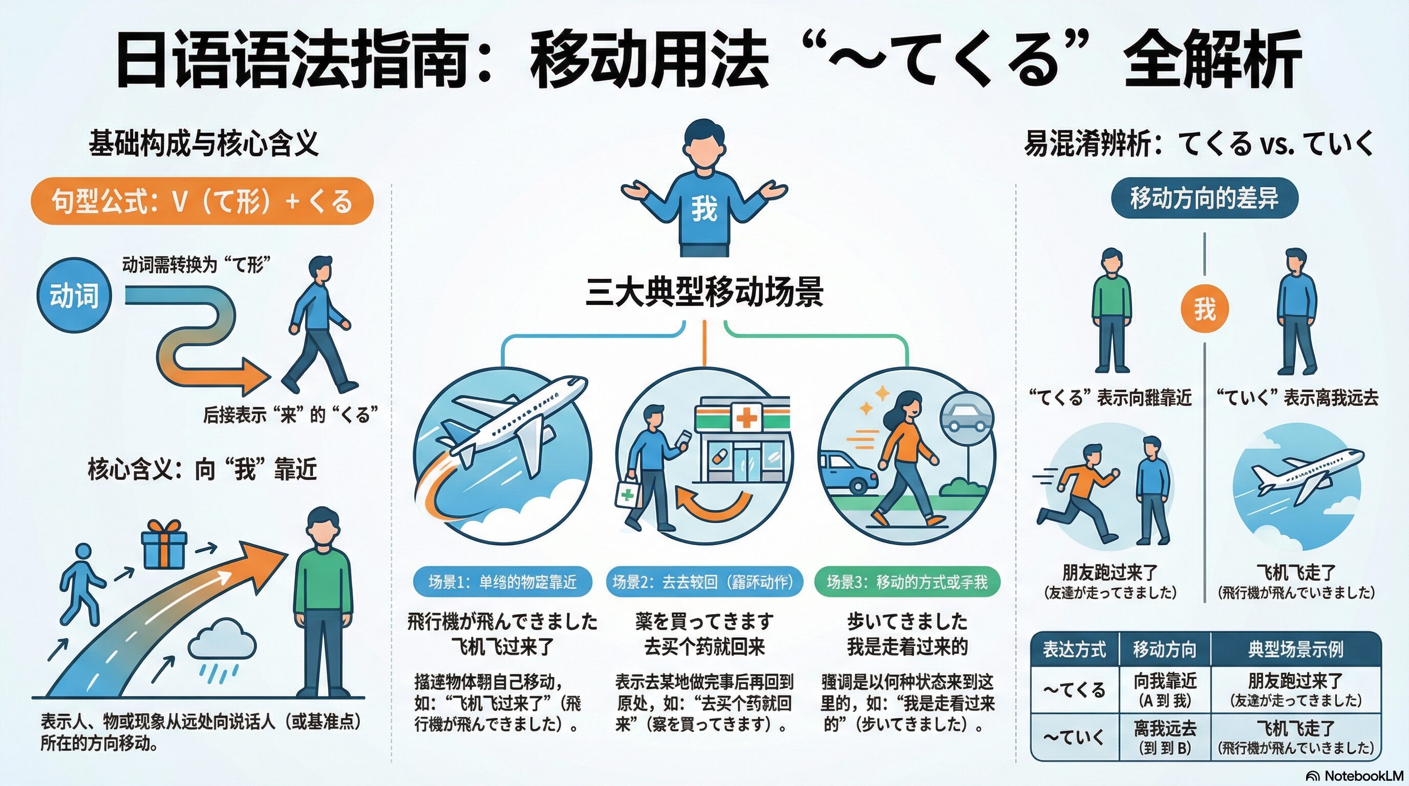 本指南将专注于“てくる”与物理移动相关的用法,包含空间移动、动作顺序及移动手段。需要特别说明的是,为了确保学习的深度与专注度,本篇将不涉及表示“变化或发展趋势”(如:暖かくなってきた)的非移动用法。