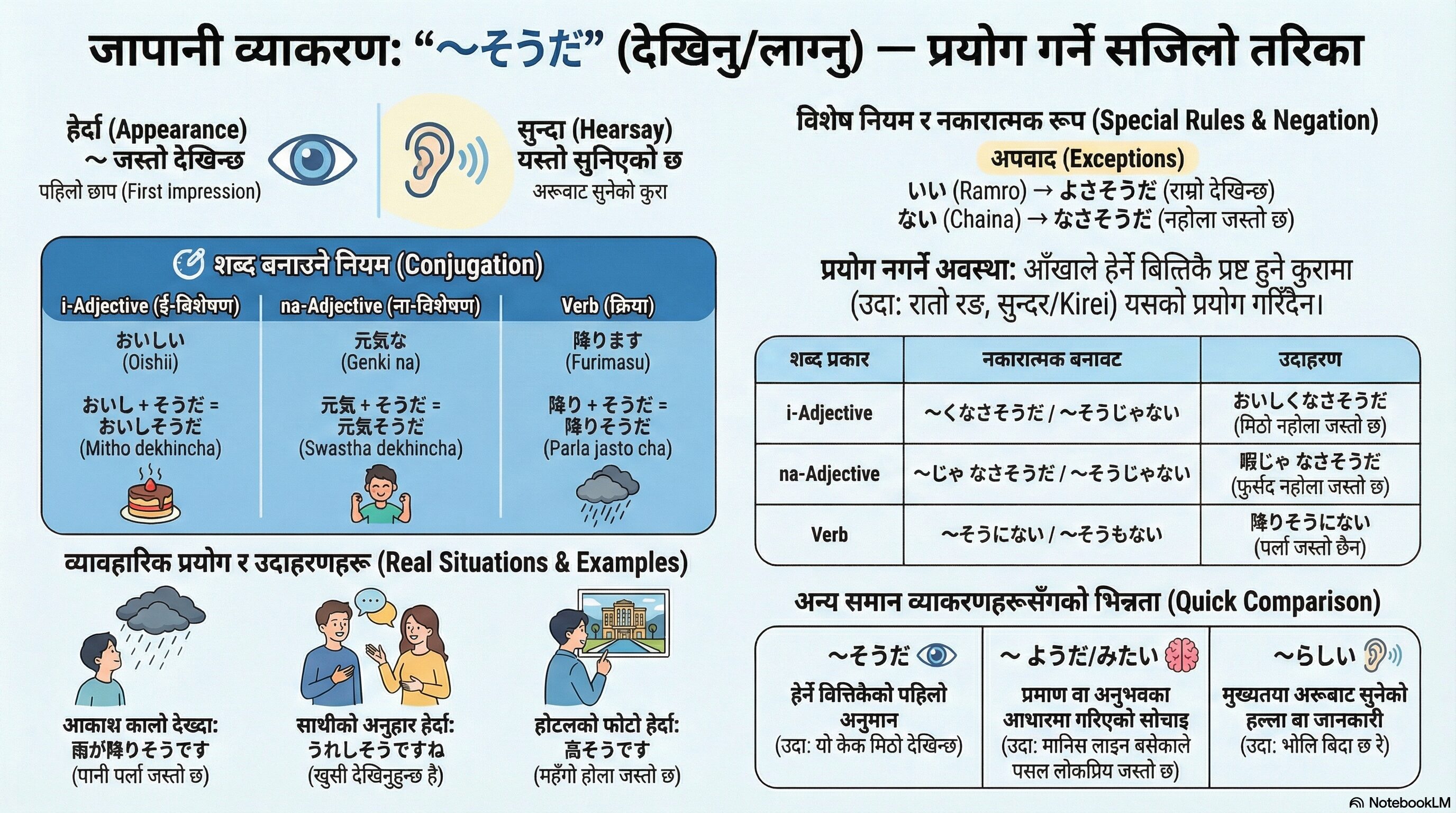 यस लेखमा हामी विशेष गरी “様態(ようたい)のそうだ” [Yōtai no Sōda] अर्थात् ‘Appearance’ (हेर्दा जस्तो देखिने) अर्थ दिने व्याकरणको बारेमा चर्चा गर्नेछौं। जापानी भाषामा “~そうだ” का दुईवटा मुख्य प्रयोगहरू छन्: एउटा ‘सुनेको कुरा’ (Hearsay) बताउन र अर्को ‘देखेको कुरा’ (Appearance) को आधारमा अनुमान गर्न। यहाँ हामी केवल दोस्रो प्रयोग अर्थात् ‘हेर्दा जस्तो देखिने’ अवस्थाको बारेमा मात्र सिक्नेछौं।